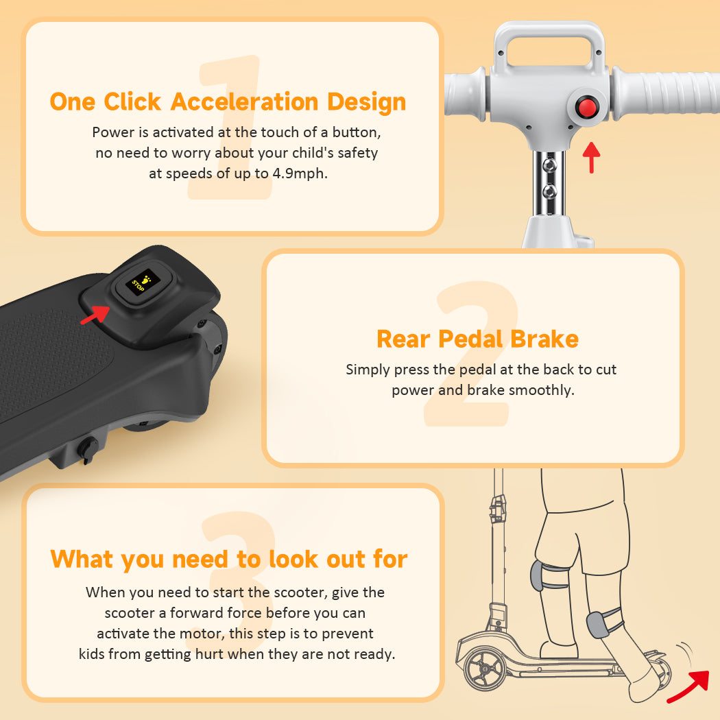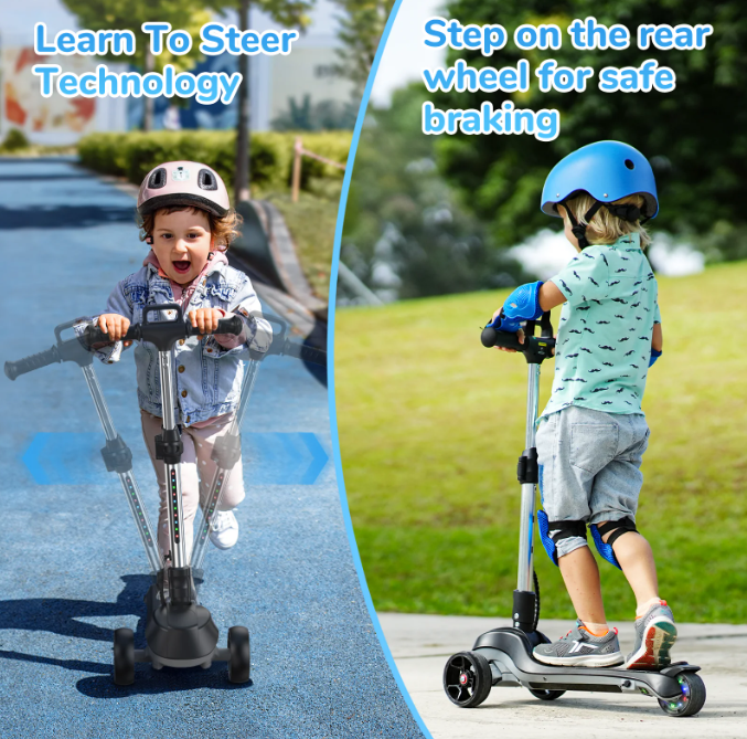 Helps your child develop balance skills, coordination, and more. This electric scooter features easy maneuvering with lean-to-steer technology, which means the kid scooter is controlled by leaning rather than turning the steering wheel.