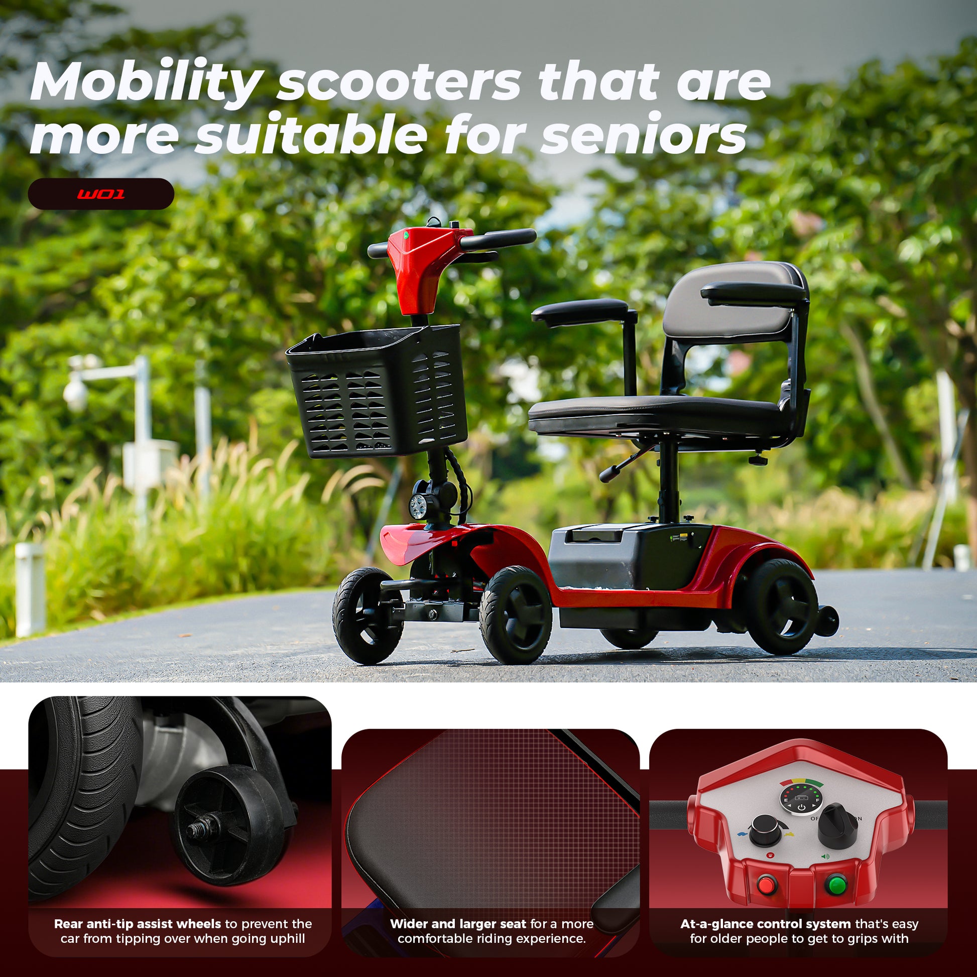 W01 mobility scooter is designed for seniors - Upgraded wider seat takes care of the comfort of the rider, no matter how far and how bumpy the journey will not make you feel uncomfortable, the front and rear are equipped with LED lights to protect the safety of the rider's night travel, if you're picking a gift for your parents/grandparents/yourself, the W01 is a very good choice!