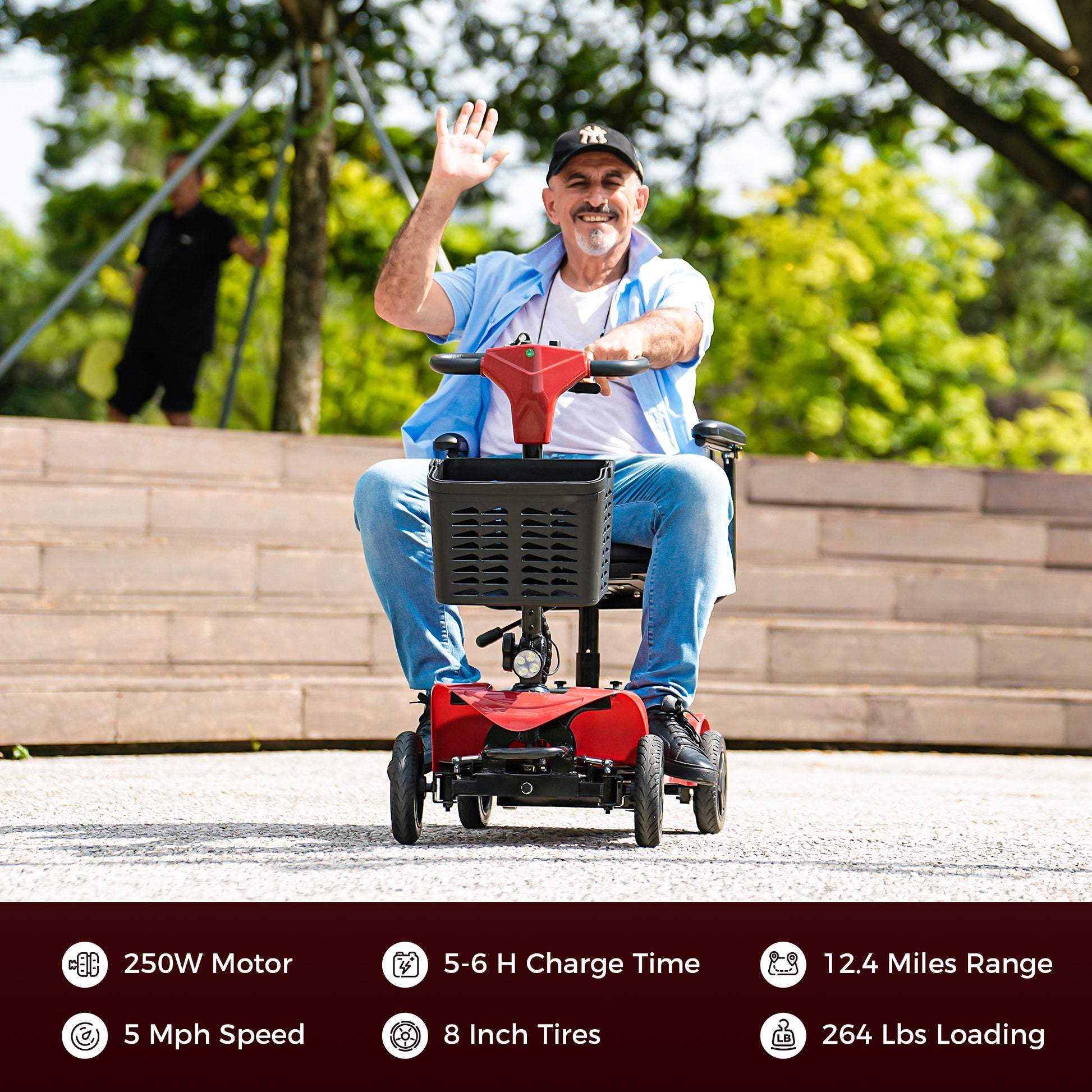 Safe Journey & Practicality First - Convenient for seniors' daily trips, stable output 250W motor with a maximum weight of 264 lbs, 5MPH speed, no need to worry about the risks associated with going too fast, up to 12 miles on a single charge, and a large-capacity storage basket for storing medication/eyeglasses or other personal belongings, making it a reliable choice for daily trips.