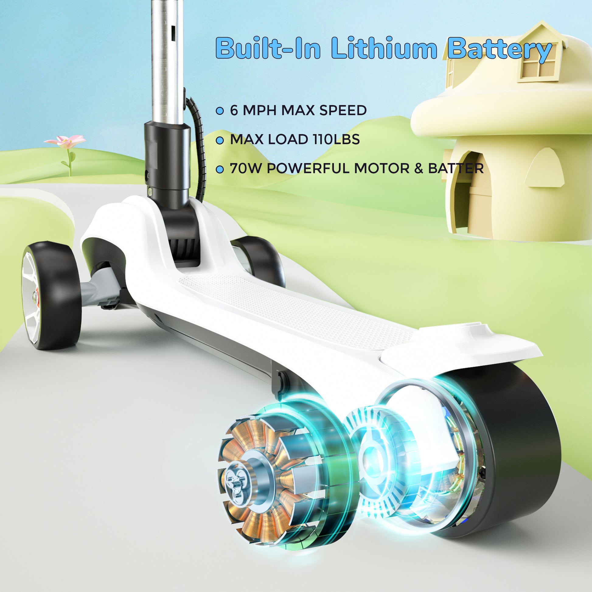 Children's Electric Scooter for 3-14, Cute & Practical. The 70-watt powerful motor can support up to a safe speed of 4.9mph and can ride for 30-60+ minutes on a single charge, so kids can play with confidence and enjoy the scooter to the fullest!