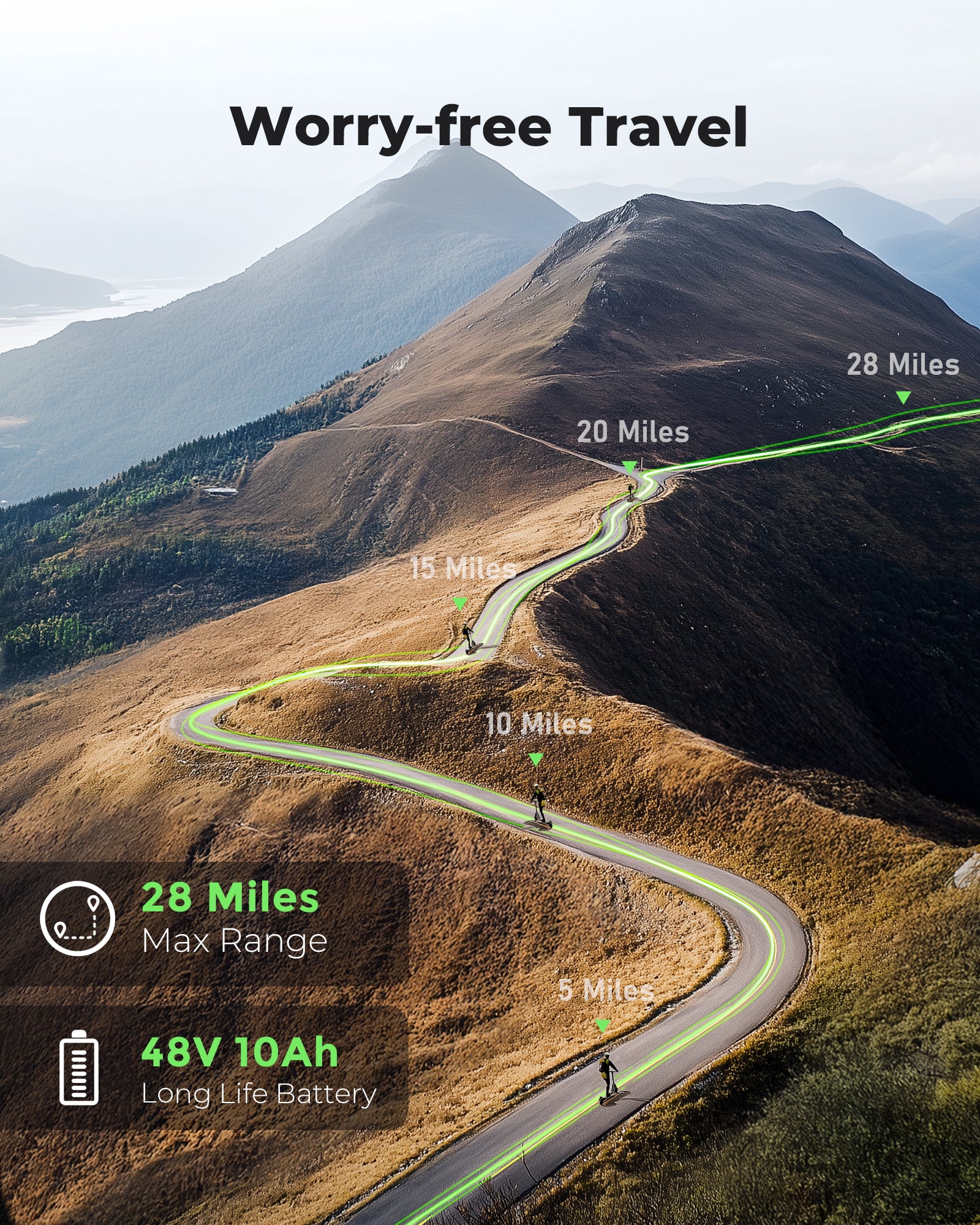 【10-Inch Off-Road Tires & Long Battery Life】Equipped with 10-inch off-road pneumatic tires, this e scooter offers enhanced grip and stability across various surfaces, from dirt trails to paved city streets. Build in a 480Wh rechargeable battery, this adult scooter offers you days of commuting without recharge. With a maximum load capacity of 330 lbs, this scooter is built to handle a variety of riders with ease.