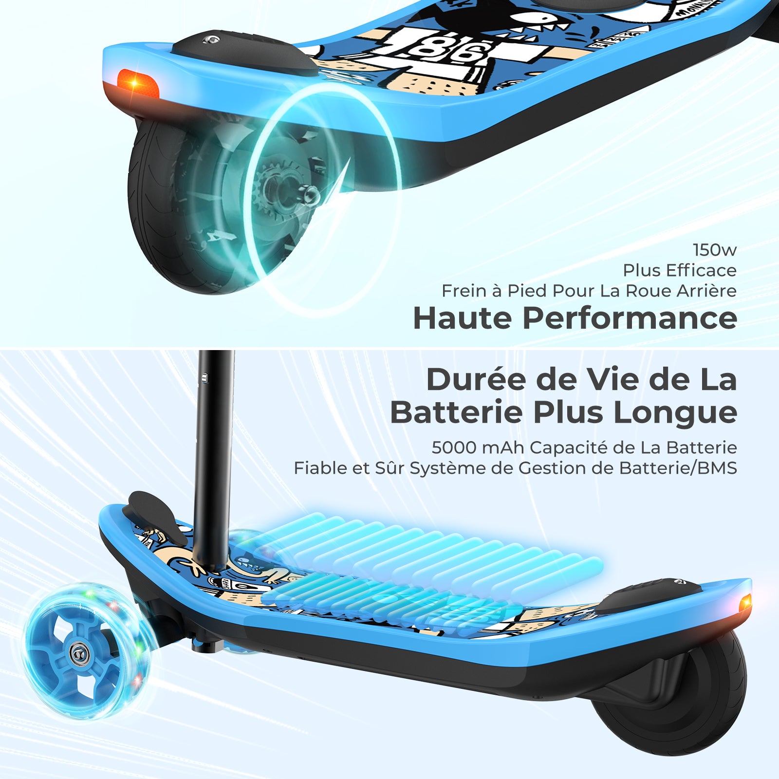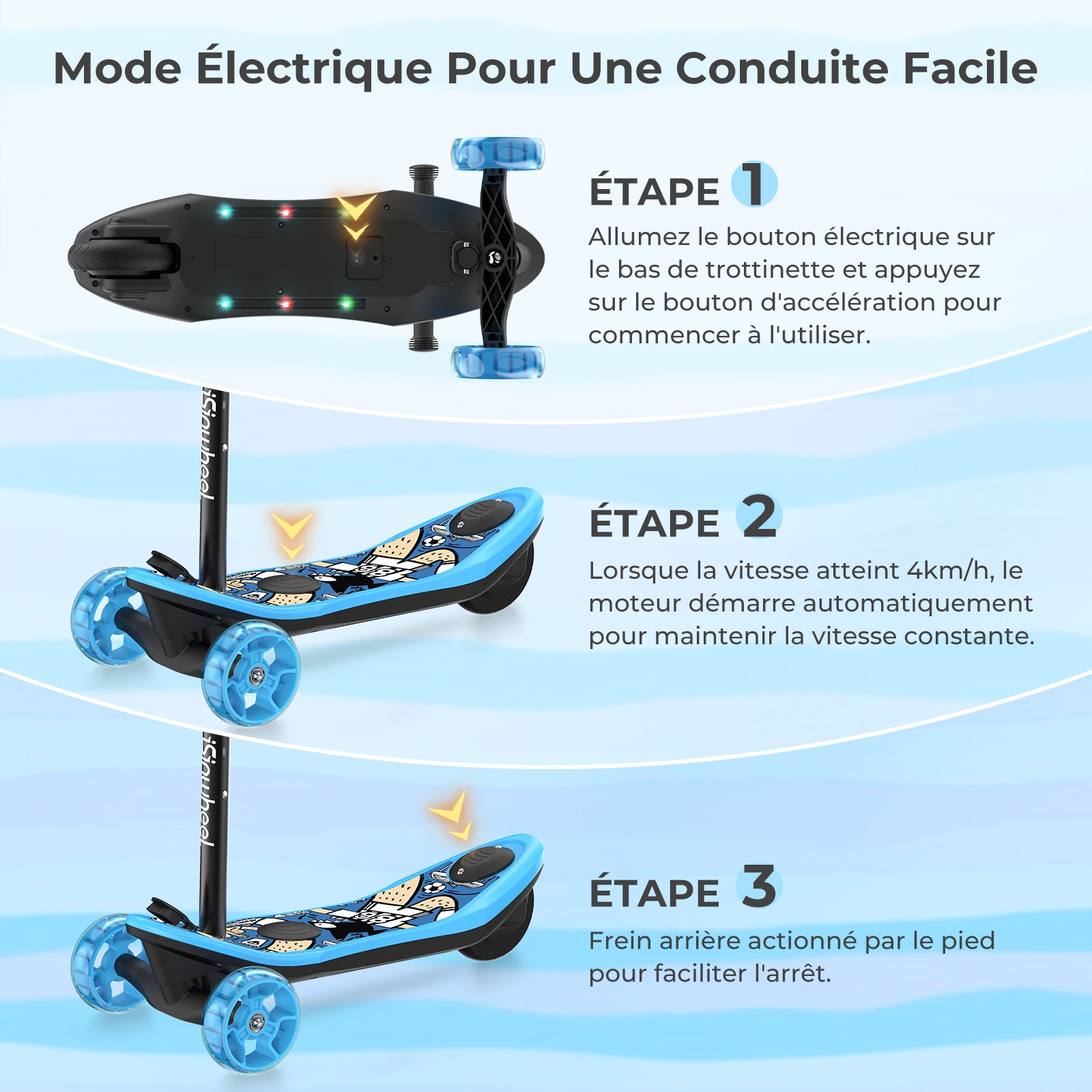 Lean To Steer Mechanism: Helps your child develop balance skills, coordination, and more. This 3 wheel electric scooter features easy maneuvering with lean-to-steer technology, which means the kid scooter is controlled by leaning rather than turning the steering wheel.