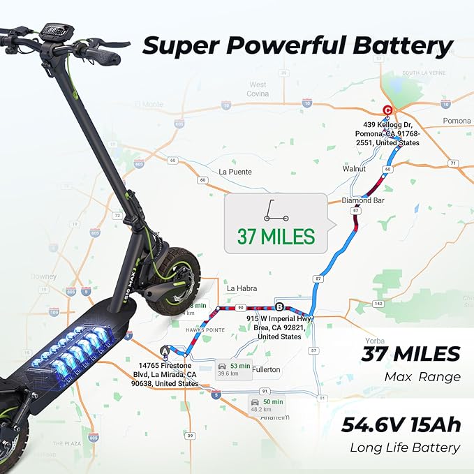 - 【1000W High-Performance Motor】 The S10Max electric scooter is powered by a 1000W brushless motor, delivering exceptional torque and reaching speed up to 28MPH. Paired with a 15Ah battery, e-scooter offers an impressive range of up to 37 miles on a single charge, making it perfect for long commutes and extended rides. S10Max scooter for adults meets the demands of both urban and off-road adventures.