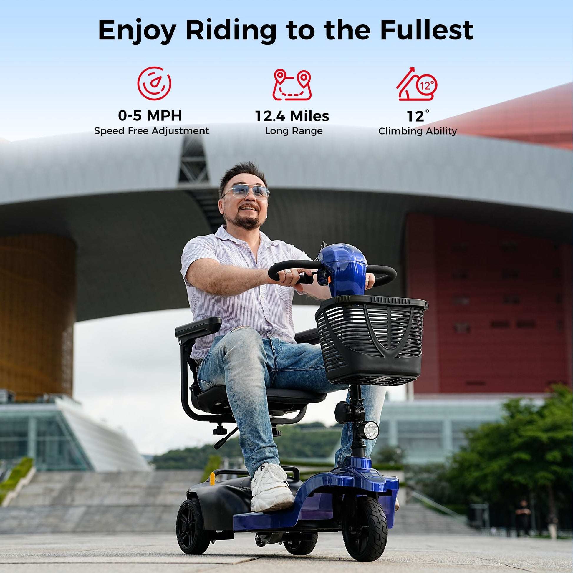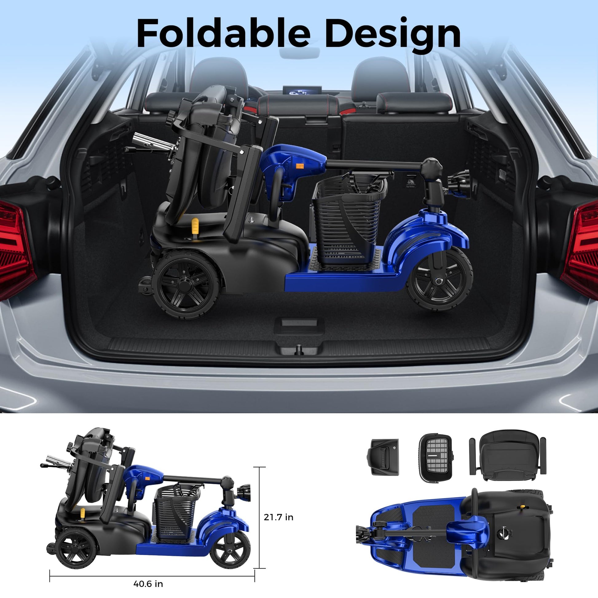 - Easy to Transport: This mobility scooter is designed for convenience, with a body that is easy to disassemble and reassemble, allowing you to store and transport it effortlessly wherever you go. Folded dimensions (without basket and seat) are 40.6 x 19.7 x 21.7 inches, unfolded dimensions (with basket and seat) are 43.3 x 19.7 x 39.4 inches, and the product weighs 85.5 pounds, fitting into most SUV trunks. UL certified.