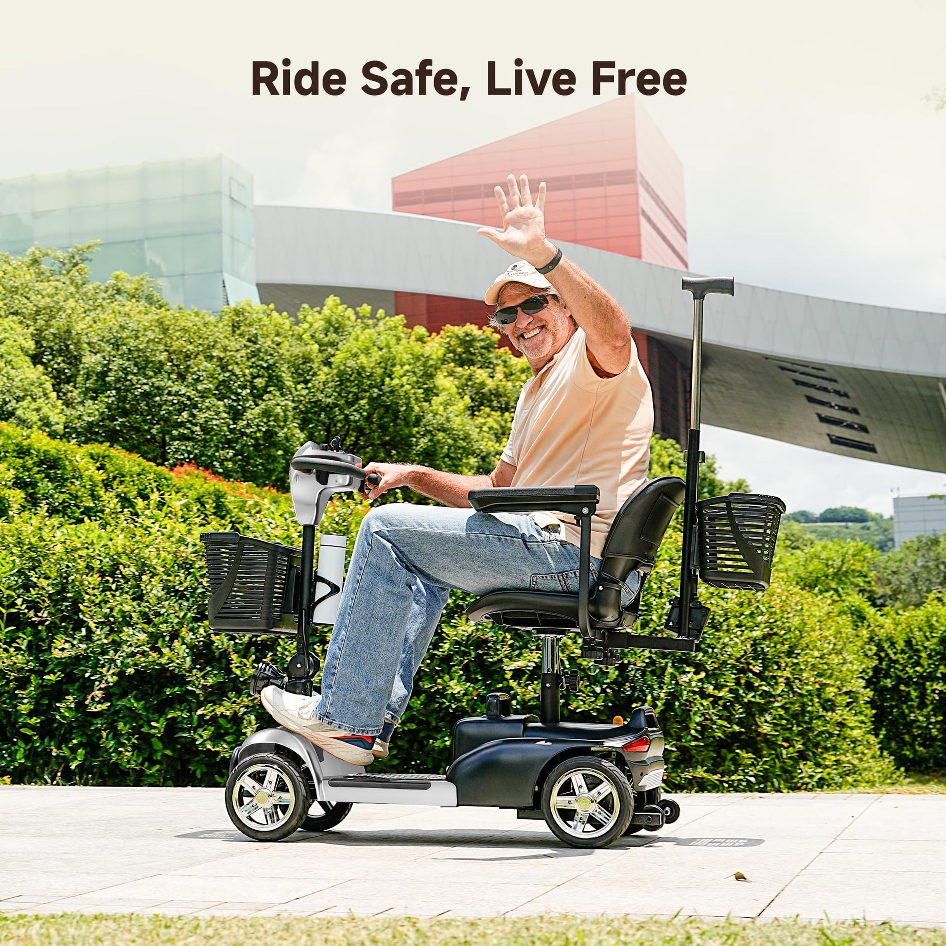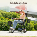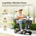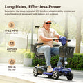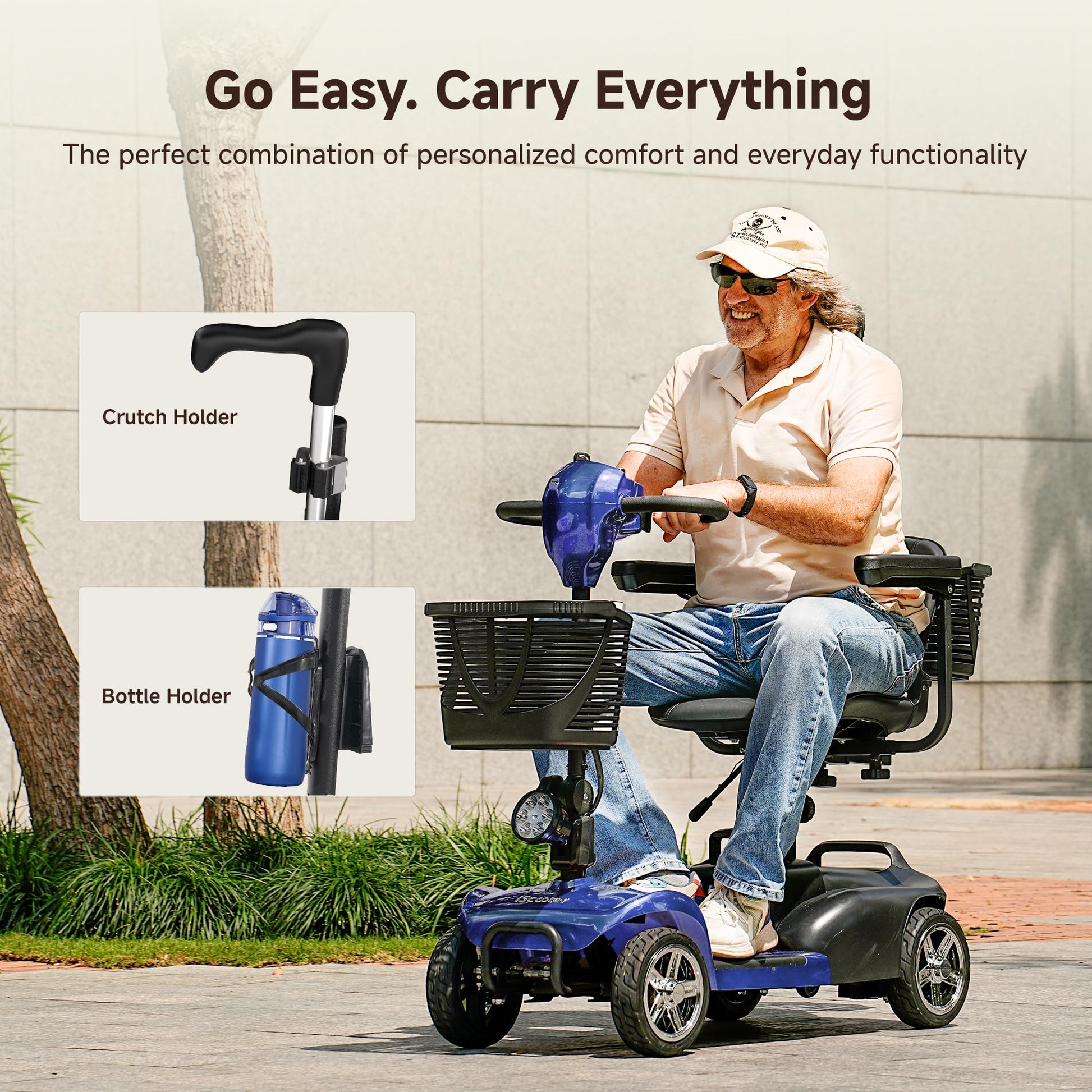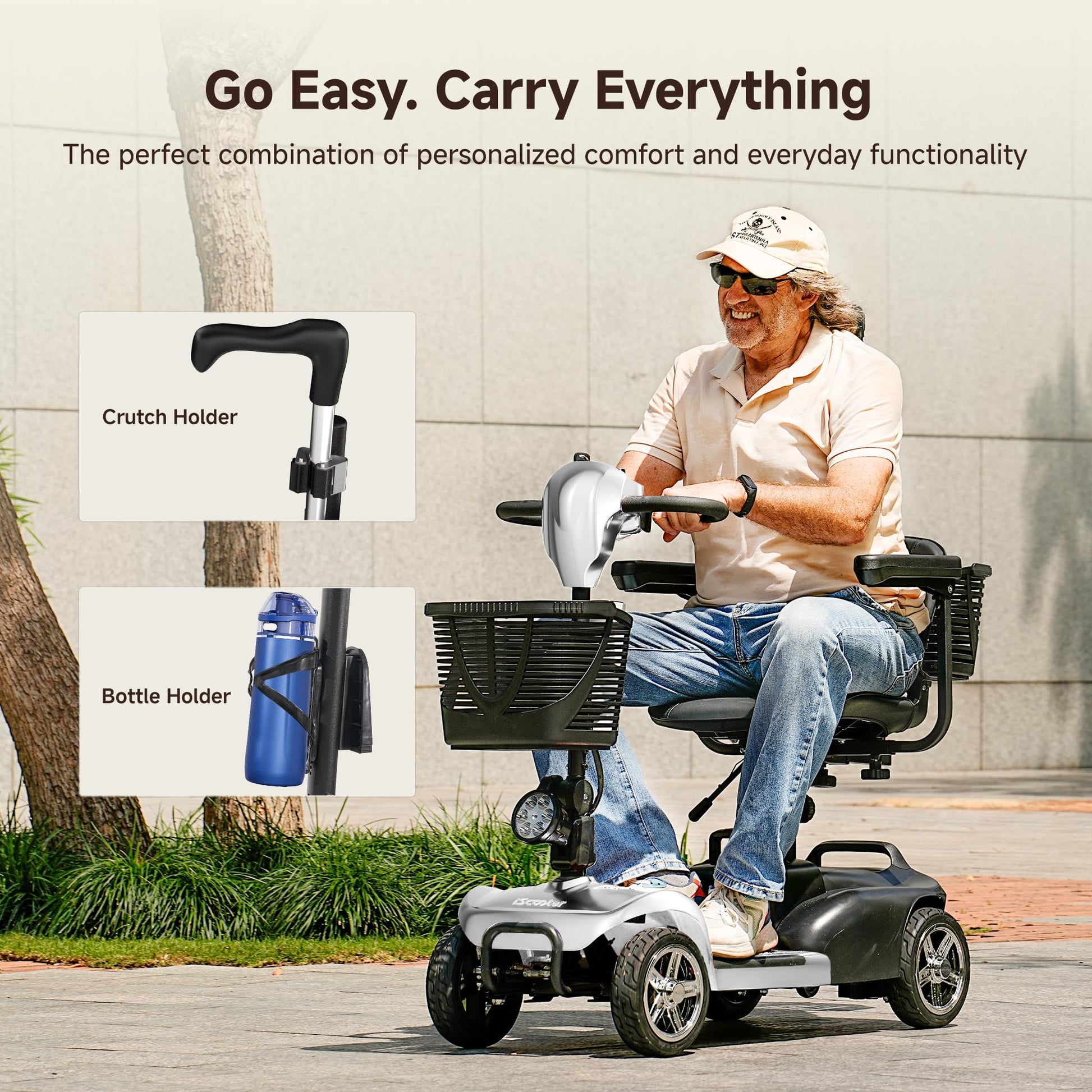 - 【Go Anywhere, Carry Everything】Our mobility scooter for senior enhances independence and convenience in daily life, featuring removable front and rear baskets (The storage basket can also be used as a handbag) and a fixed cup holder for easy storage of items and beverages. The fixed cane holder securely stores your walking aid in just one second, and you can also attach items like fishing rods or small umbrellas to the cane holder to enjoy outdoor activities.