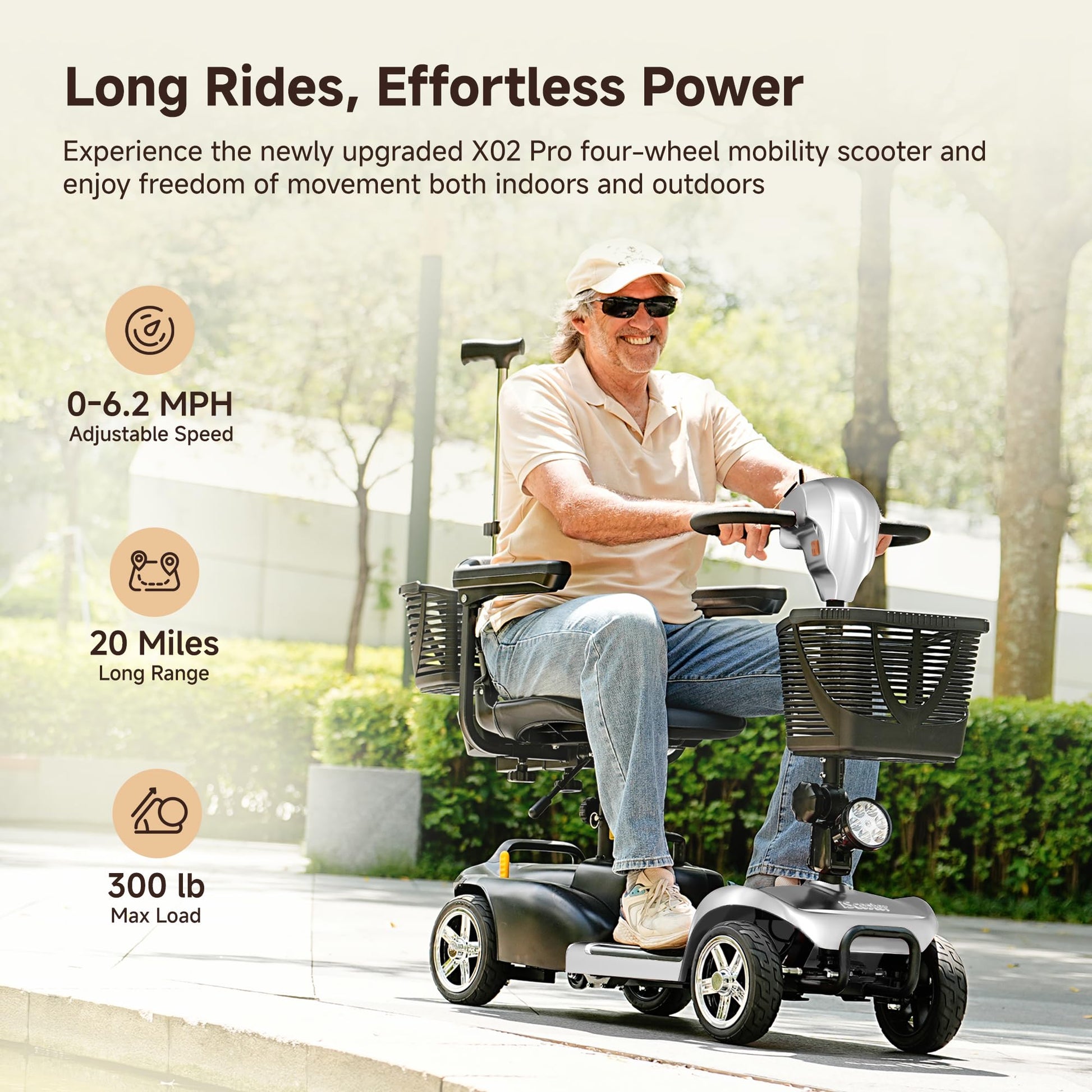 - 【Intuitive Controls, Effortless Handling】Our X02 Pro mobility scooter features an intuitive control panel that allows you to easily take control and get started quickly. Speed can be smoothly adjusted between 0-6.2 MPH, allowing you to customize the speed to your preferences. The automatic braking function stops the scooter when you release the forward control, giving you confidence in every journey.