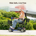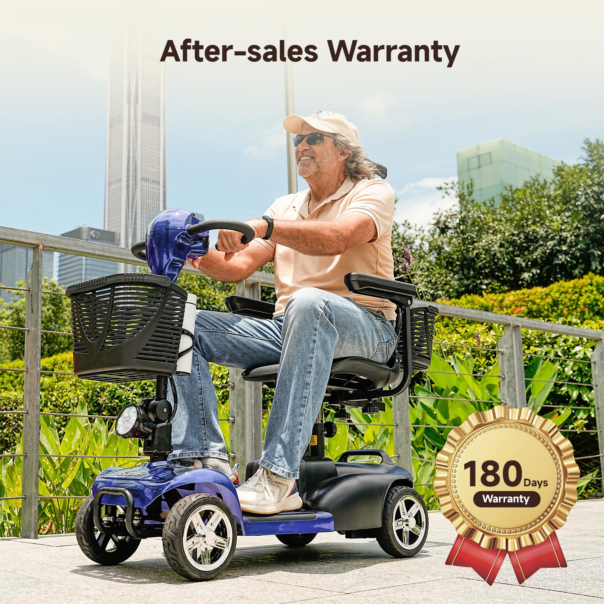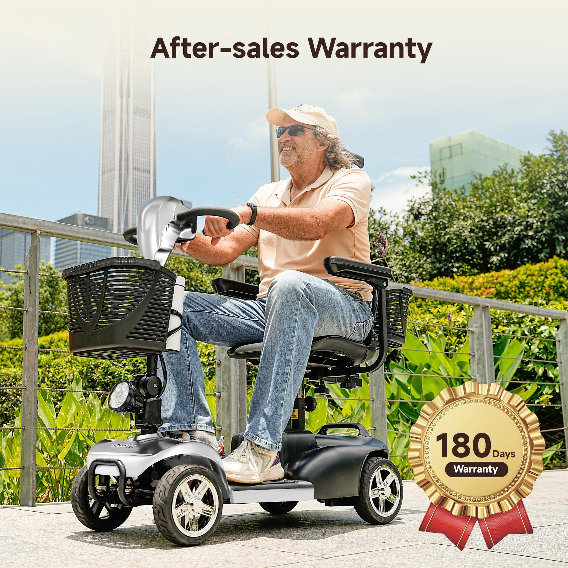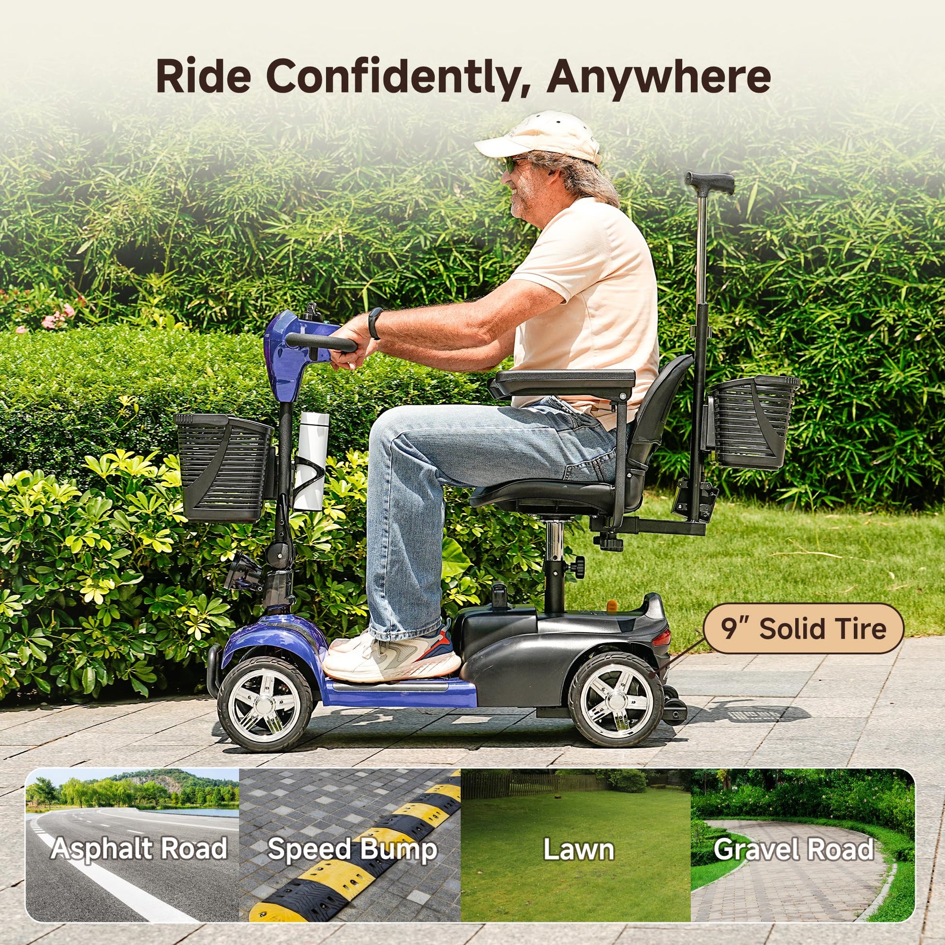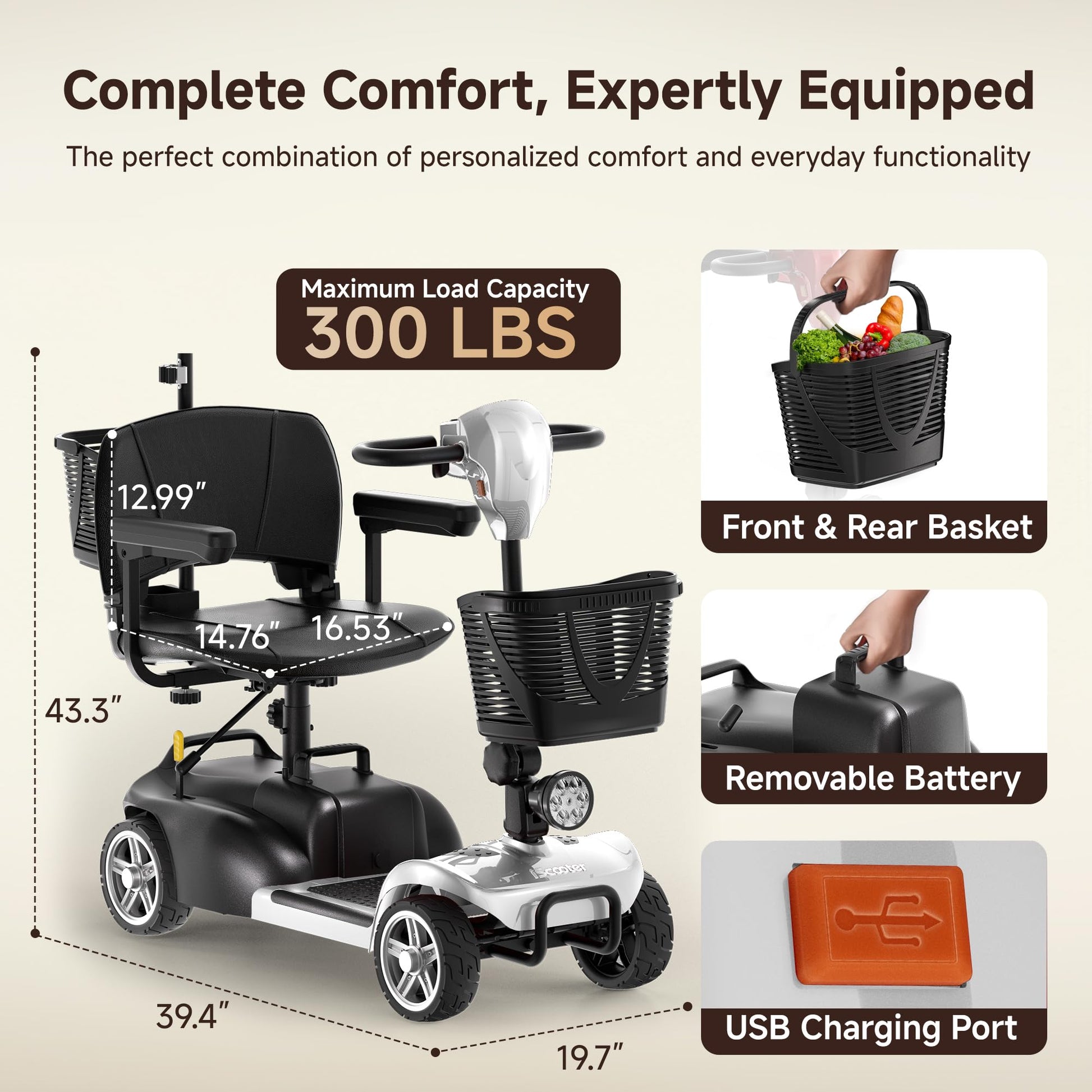 - 【Superior Comfort for Happy Rides】This senior mobility scooter features a spacious footrest area, an adjustable handlebar angle, a 360-degree rotatable and height-adjustable padded seat, and foldable handrails for easy boarding and disembarking. Enhancing driving comfort, every ride is a joyful experience.