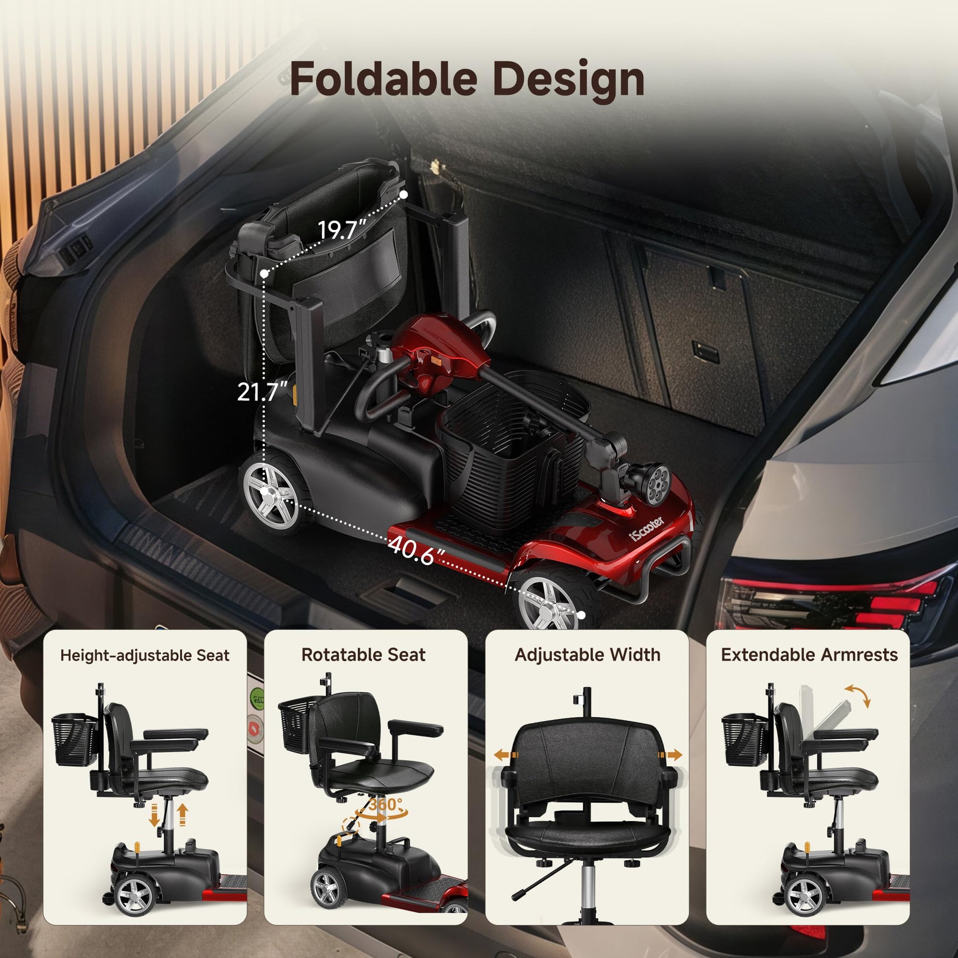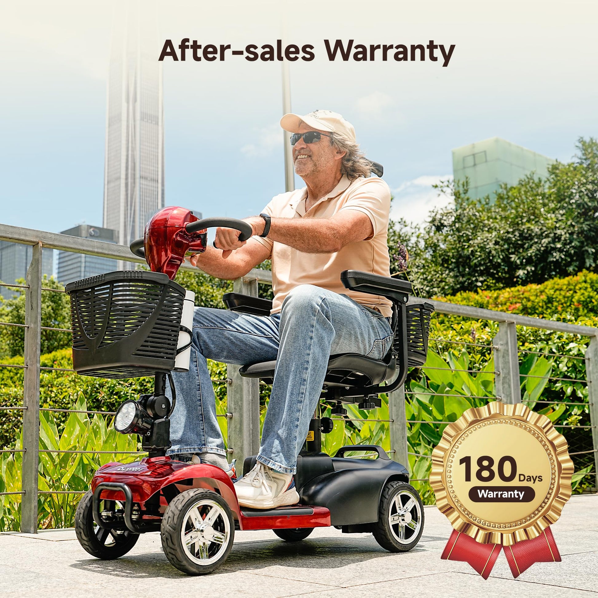- 【Superior Comfort for Happy Rides】This senior mobility scooter features a spacious footrest area, an adjustable handlebar angle, a 360-degree rotatable and height-adjustable padded seat, and foldable handrails for easy boarding and disembarking. Enhancing driving comfort, every ride is a joyful experience.